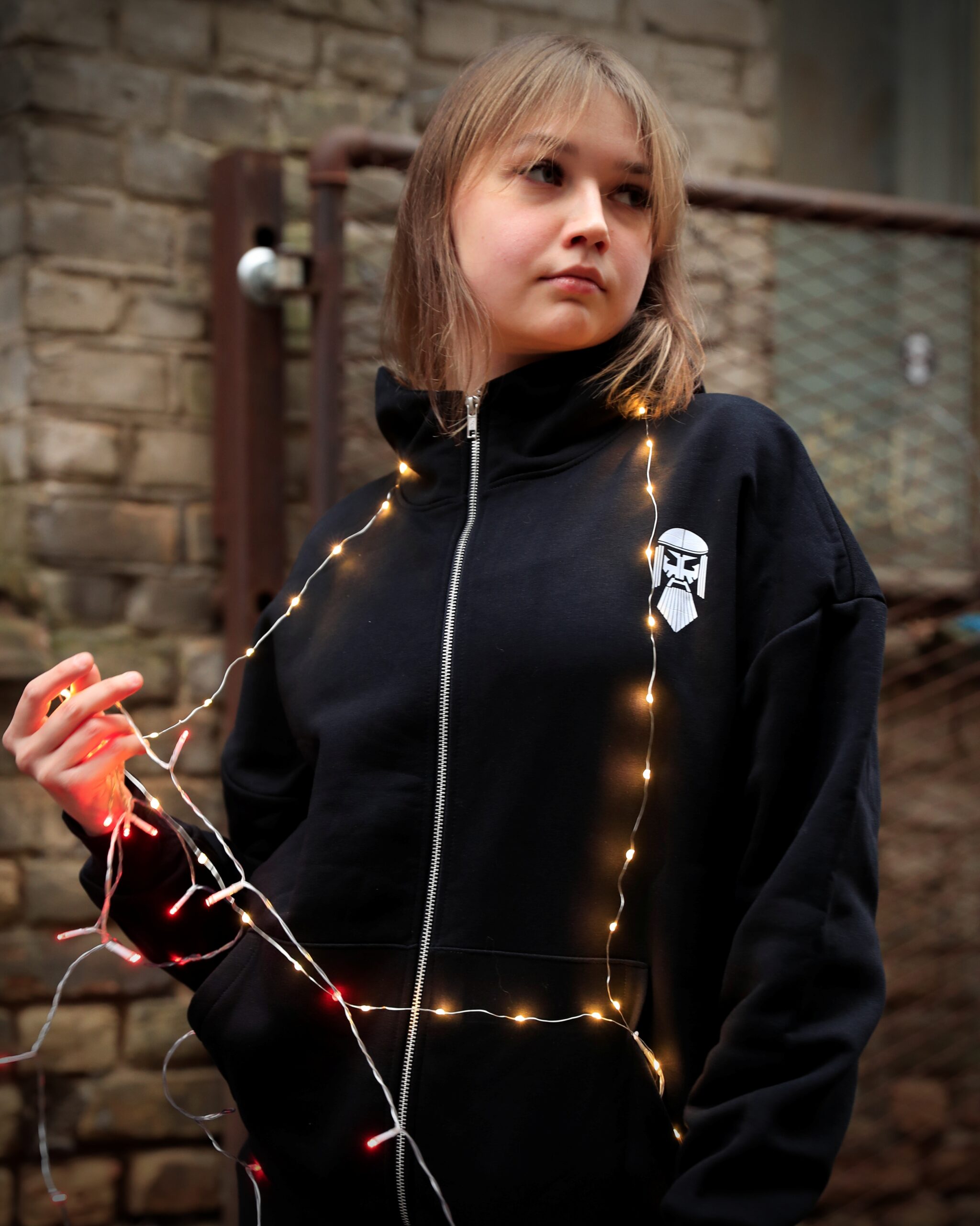 Unisex jaka ar kapuci un metāla rāvējslēdzēju. Kakla lenta. Rievotas aproces un apakšmala. Oderēta kapuce, ar atbilstošu savilkšanas auklu un metāla uzgaļiem. Modernas, platas ribu aproces un jostasvieta ar elastānu.