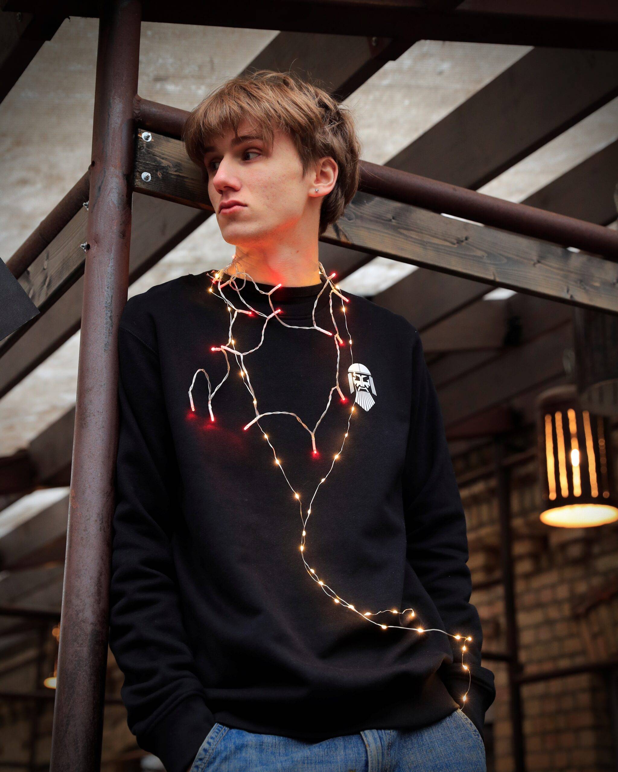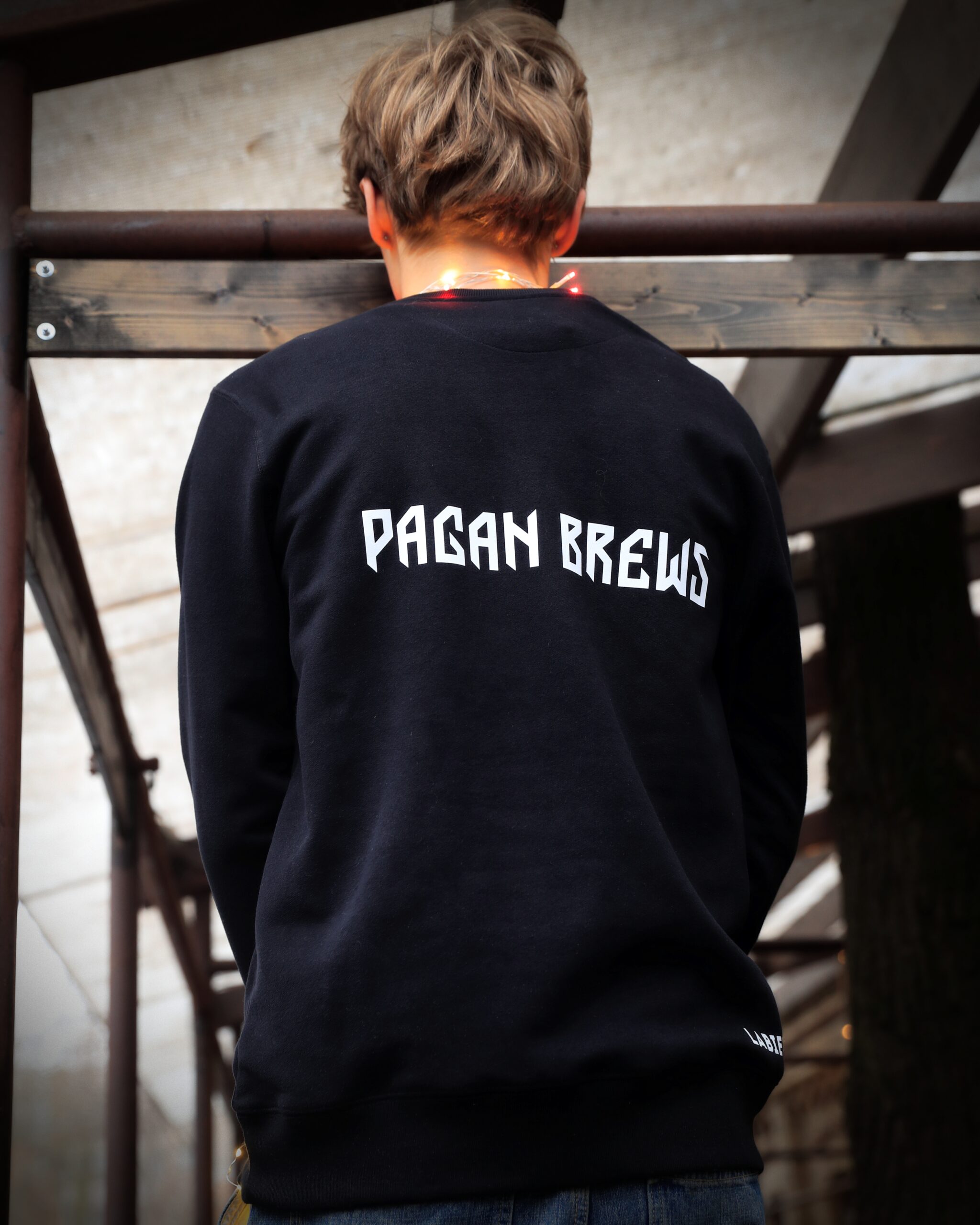 Mīksts, klasiskas formas džemperis. Kakla lente, sānu šuves. Uz muguras kakla zonā apdruka Pagan Brews, priekšpusē uz kreisās krūts Labietis logo simbols.